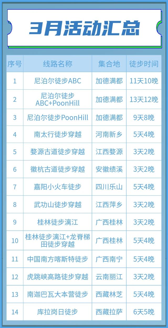 #徒步者联盟十一月活动推荐 冬季来临,各大徒步线路陆续封山 最后一个月的窗口期,贡嘎山西南坡四期连发 第一期:2024年11月1***-6*** 第二期:2024年11月8***-13*** 第三期:2024年11月15***-20*** 第四期:2024年11月22***-27***